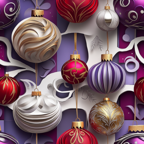 A paper sculpture diorama of christmas ornaments, The color scheme includes silver, purple, red, and gold, It was created in the style of Eiko Ojala –tile