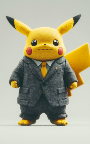 a plastic model diorama of a Pikachu standing in front of a white background. Pikachu is dressed professionally and looks very confident. Pikachu is in the middle of giving a speach. Tilt-shift, diorama. --ar 5:8