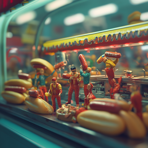 a diorama of people made of hotdogs placing random object on top of other random objects. Photorealistic. Hogh detail. Odd lighting and odd color choice.
