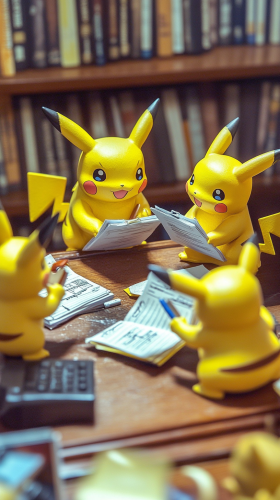 a plastic toy diorama of 4 Pikachus working together around a desk in a college classroom. The Pikachus are holding papers and pens as they try to figure out a difficult vocabulary word. --ar 9:16