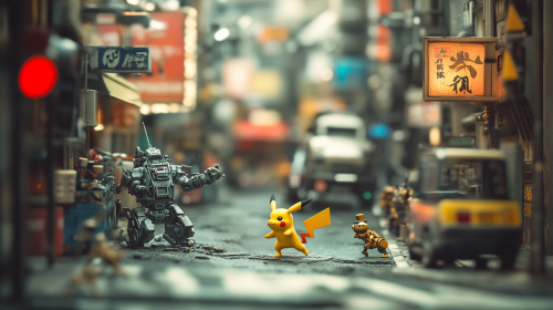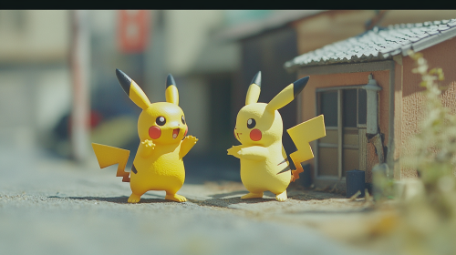 a plastic diorama of two PIkachus standing next to each other. One Pikachu is alive, while the other Pikachu is an android, however both look very similar. Miniature, tilt-shift. --ar 16:9