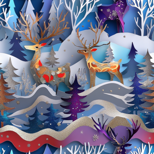A paper sculpture diorama of reindeer the snow, christmas trees in the mix, The color scheme includes silver, blue, purple, red, and gold, It was created in the style of Eiko Ojala --tile