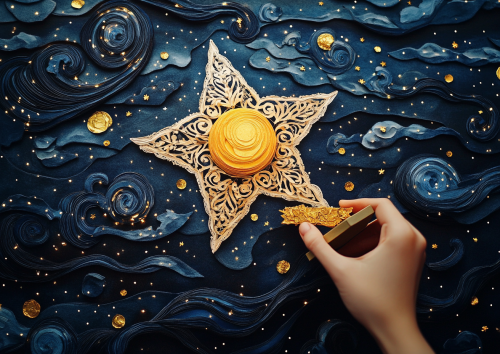 A paper diorama painting watercolor of Starry night sky, The star is made from lace and ribbon, moon with ornate gold border, golden sun in the middle, nightcore style, black decoration, beautiful scenery, navy blue background, romanticism, many stars, cinematic lighting, The scene should have a celestial theme with moonlight filtering through clouds. There must be a hand holding an open box or book that contains only one small gold leaf. Paper art. --ar 97:69