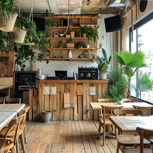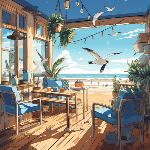 illustration of interior of a cartoon beach cafe with a few plants, mainly blue and white, a few seagulls, relax and chill, music, coffee on a table, bar, no people, beach