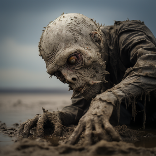 grim depressed distraught crying fish man desperate burying bones in the mud