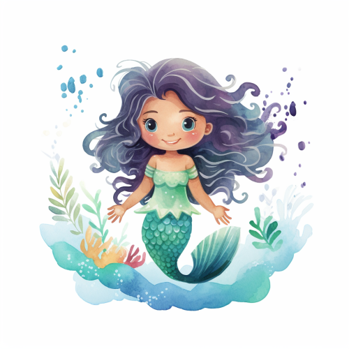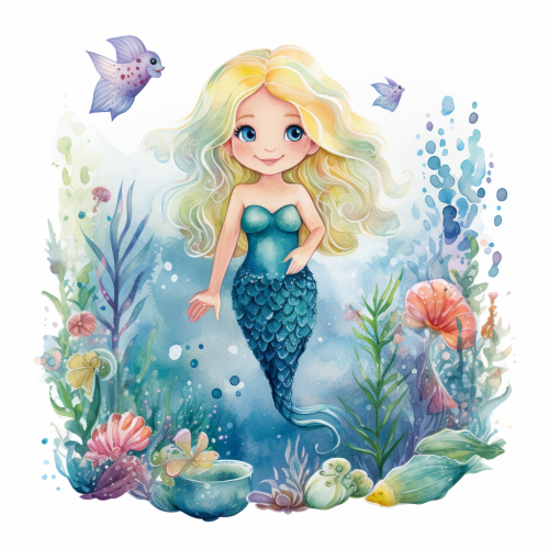 Create a charming clipart featuring an adorable and plump blonde child mermaid, portrayed in a soft and enchanting watercolor style. Set the scene against a clean white background, emphasizing the whimsical and fairytale-like atmosphere. Imagine this delightful mermaid child frolicking joyfully in the sea, surrounded by the magic of the underwater world. Their plump, cheerful presence should resonate with the endearing quality of a beloved children's book illustration, evoking a sense of wonder and innocence. Employ a palette of soft pastel colors and muted hues, creating a dreamy and ethereal ambiance. To enhance the enchantment, incorporate opalescent tones that glisten and shimmer, adding a touch of magic to the scene. Ensure the artwork is of the highest quality, with meticulous attention to detail in every stroke of the watercolor. The aim is to craft a clipart that transports viewers to a whimsical world under the sea, where the plump blonde child mermaid invites them to join in the enchantment of childhood imagination and wonder --v 5.2