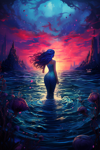 a beautiful painting , mermaid, in the style of dan mumford, richard doyle, robert crowley, henri le fauconnier, in the style of detailed vibrant illustrations, uhd image, whimsical illustrations, glowing lights, enchanting, cyan, 8k resolution,atmospheric, luminescent color scheme, in the style of psychedelic artwork, gorgeous colors, romanticized nature, threaded tapestries, i can't believe how beautiful this is, in the style of psychedelic, vibrant tapestries, contrasting lights and darks, dark cyan and purple --ar 2:3