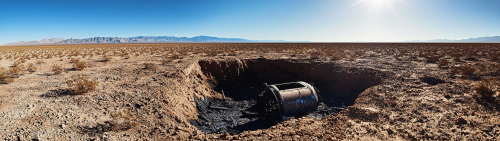 Digital photo of a small crashed satellite hidden deep in a hole depression in the Navada desert. The satellite is in the depression below ground level. The satellite is charred with some metal visible. Sunny day with clear sky and mountains visible near the horizon. Lens flare, harsh lighting. --ar 32:9 --quality 2 --style raw --stylize 0