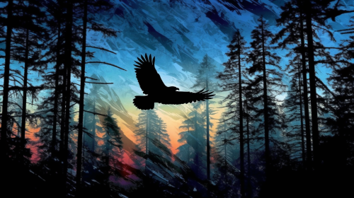 Picture an intricate design that, upon close inspection, reveals a detailed landscape of a serene forest. However, when viewed from a distance or with blurred vision, the image morphs into the silhouette of a majestic bird in flight. Medium: hyper-realistic photography. Style: reminiscent of optical illusion artworks, where two images coexist in one. Lighting: soft ambient light, casting a gentle glow on the forest details while highlighting the bird's silhouette when viewed from afar. Colors: a blend of earthy forest greens and the deep blues of the bird. Composition: using a Canon EOS 5D Mark IV DSLR camera with an EF 50mm f/1.8 STM lens, capturing the scene in ultra-high resolution 16k detail. --ar 16:9 --v 5.1 --style raw --s 750