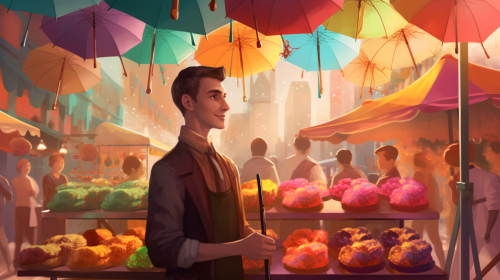 Design an illustration showcasing a bold entrepreneur at his waffle and sweets stall, exuding happiness and warmth as he presents a tray of delectable treats to customers. Envision a bustling outdoor marketplace with colorful umbrellas and cheerful patrons, emphasizing the vendor's vibrant personality and the delightful experience of indulging in his sweet offerings. Illustration, digital art, use a combination of bold colors and playful details to convey the festive atmosphere, --ar 16:9 --v 5.0