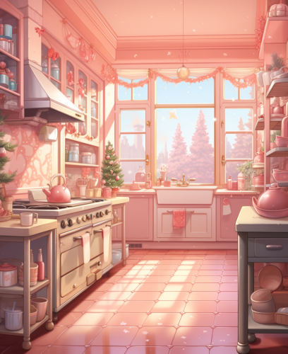 an illustration of a kitchen with a Christmas tree, in the style of kawaii aesthetic, i can't believe how beautiful this is, cute and dreamy, Powder pink and light red, pastel-colored scenes, romantic scenes. --s 250 --no people --ar 838:1020