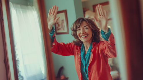 a spiritual woman (40 year ) smiling at her computer during a virtual meeting, engaging with people on screen. wearing red and blue Keywords: community building, connection, collaboration. Camera: DSLR, Lens: 35mm. Warm, soft lighting for connection. --ar 16:9