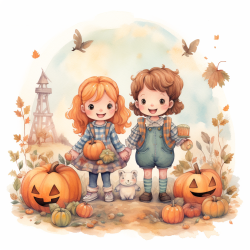 A vibrant and whimsical watercolor pattern depicting a lively pumpkin patch filled with a variety of pumpkins carved into unique and expressive Jack-o'-lantern faces. The pumpkins range in size and shape, from small, round gourds to large, elongated ones, each with a distinct character. Some Jack-o'-lanterns have wide, toothy grins, while others display mischievous smirks, surprised expressions, or spooky, jagged smiles. The carvings are detailed, with some featuring intricate designs like stars, swirls, and crescent moons, while others have simple yet charming cutouts. The watercolor style adds a soft, hand-painted feel to the scene, with rich autumnal hues of orange, yellow, and green blending seamlessly together. The pumpkins are interspersed with winding, curly vines, fallen autumn leaves in shades of red, gold, and brown, and the occasional flickering candlelight that illuminates the faces of the Jack-o'-lanterns, casting playful shadows. The background is filled with soft washes of color, suggesting a crisp, cool evening in a pumpkin field, with distant trees and rolling hills fading into the background. The composition is designed to be a seamless, repeating tile pattern, creating a cozy and festive atmosphere perfect for the Halloween season. The overall vibe is cheerful and slightly spooky, capturing the essence of a fun, family-friendly autumn adventure.