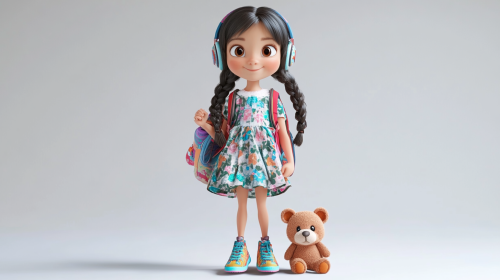 3D animation in Disney style, full-length Kazakh girl, 10 years old, on a white background in the studio, in a long braid, in a fashionable dress and colorful sneakers with bright laces. expressive eyes and a friendly smile, A stylish backpack is slung over the shoulder, headphones are around the neck, and a teddy bear is in the hand. high contrast lighting, bright and cheerful atmosphere, --ar 16:9 --v 6.1