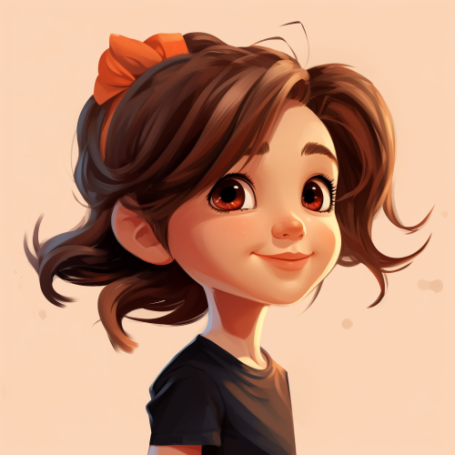 cartoon-style young girl with short brown hair tied in two red ribbons, wearing a yellow shirt and bright red overalls. She is smiling confidently and standing in a playful pose. Her shoes are black, and her face has round red cheeks, adding to her cheerful expression. The background is simple, focusing attention on the character. --niji 6