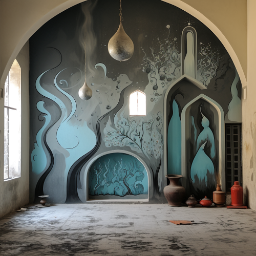 a spray painted drawing of the interior of Akhavan House in Kashan with a persian mythical creature and an object with an unfamiliar shape inspired by Islamic Menareh, surreal and minimal, visually appealing composition