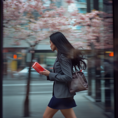 Realistic photo. A business district where cherry blossoms are dancing. A woman with long black hair is walking, wearing a gray business suit and a navy miniskirt. He holds a long red box in his right hand. The camera is held horizontally and the woman moves to the side.