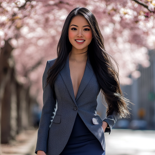 Realistic photo. A business district where cherry blossoms are dancing. A woman with long black hair is walking, wearing a gray business suit and a navy miniskirt. He holds a small red elongated box in the palm of his right hand. The camera is held horizontally and the woman moves to the side.