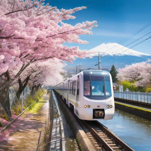 A thousand cherry blossoms in Miyagi, shiorishi river, mountain background, Japan, spring, cozy sunny day, bullet train, komachi shinkansen, Japan rail way