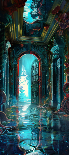 a hall of doors in Alice in Wonderland, high quality and realistic illustration --ar 9:20 --v 6.0