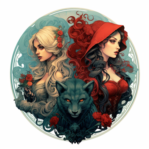 Illustration with a fantasy-inspired, gothic Cinderella, Red Riding Hood, Belle, and Alice in Wonderland.