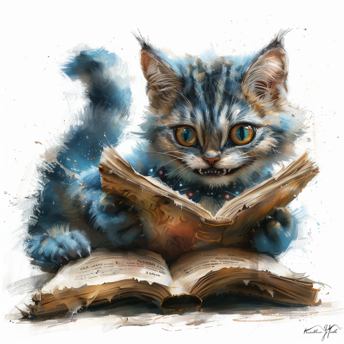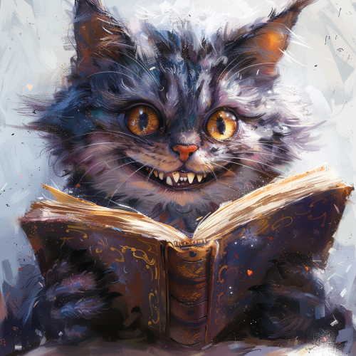 exaggerated smiling Cheshire cat reading a book, Alice in Wonderland inspired character, three-quarter view, full body, simple features and harmonious colors, harmonious brushstrokes, isolated at white background. --v 6.0 --stylize 750