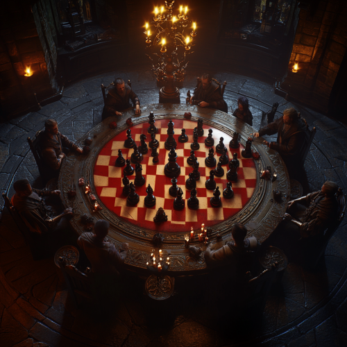 3d chess boards, 3 levels, with red checkerboards, connected together, on a table, in a dark manor, on the centre of a circular table, 4 people sit around the table, playing chess, night, lit by candleabras, cinematic, hyper deatailed