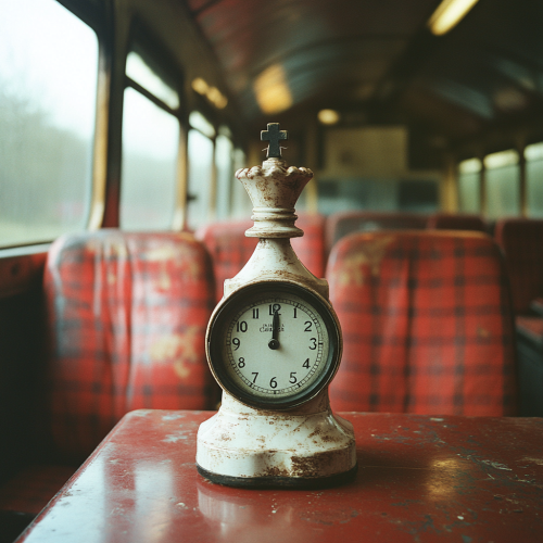 Extreme close up of a dual face chess clock on a table, inside a 1990s Irish train carriage, daylight, worn red seats, film grain, cinematic look --style raw --s 250