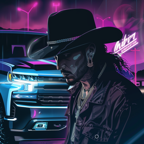 a Latino rapper with a black cowboy hat with white low Air Force 1s in front of a Chevrolet Silverado, cyberpunk style