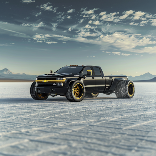 chevrolet 3500hd dually race truck. The rendering should be a 3/4 side view on bonneville salt flats. Canon EOS R5 (or any high-resolution camera suitable for automotive photography) Lens: telephoto lens, approximately 300mm, ensuring a full view of the car while also capturing its surrounding environment Shutter Speed: 1/160 sec (to guarantee sharpness) Aperture: f/5.6 (to achieve a balance between focusing on the car and providing some depth to the background) ISO: 100