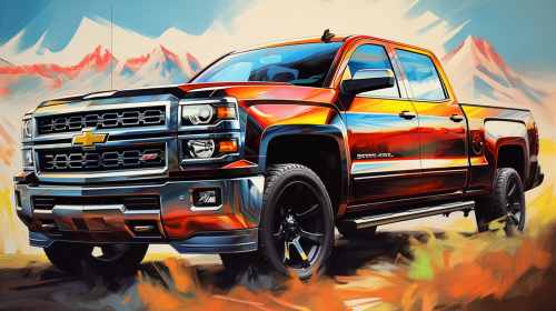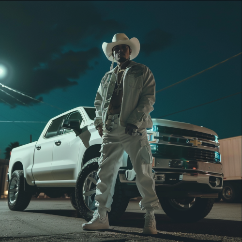 a Latino cowboy rapper with white Air Force 1s in front of a Chevrolet Silverado, cyberpunk style