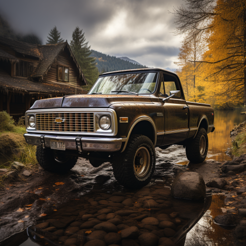 1972 Chevrolet Cheyenne Super 4x4 pickup truck C10 1/2 ton at a fishing lake baitshop with a dog and fishing gear in the style of a vintage magazine cover like field & Stream and outdoor life , --s 1000 --v 5.2 --c 10 --ar 1:1