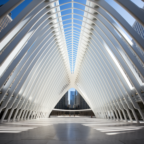 Adjacent to the Ground Zero memorial is the Hub's centerpiece, the Oculus, designed by Spanish architect Santiago Calatrava to resemble a dove taking flight. The structure is formed by softly-curving, white, steel ribs that rise from below the ground to form an elliptical dome over a vast concourse