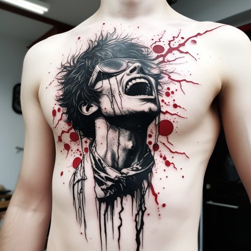 black and white ink brush tattoo. sub-human man with blindfold screaming into sky. red highlights