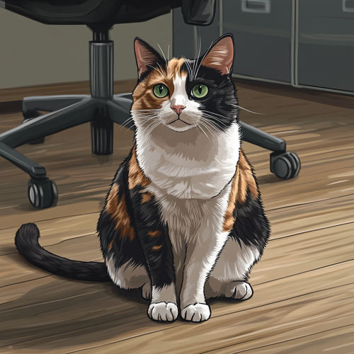A calico cat sits on the floor of an office, facing forward with green eyes and white fur in the front and brown patches around its neck, next to chair casters. The background is a light wood floor with a gray table leg behind it. keep it realistic but make it look more cartoon style