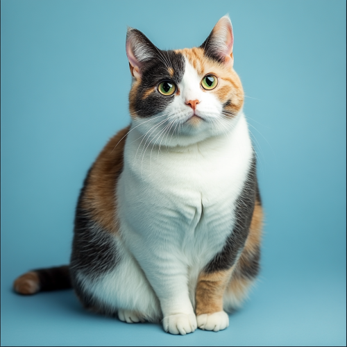 A photograph of an obese calico cat with white, brown, and grey fur sitting on the floor in front view. The background is a plain light blue, creating a contrast between her fur color and the backdrop. She has green eyes that sparkle curiously at the camera as she poses for the photo. Her posture suggests comfort or contentment, with one paw extended towards the camera, giving off a friendly vibe to this portrait. This shot was taken by a professional photographer using high-quality equipment. With a brown nose. Keep it realistic with a touch from cartoon style