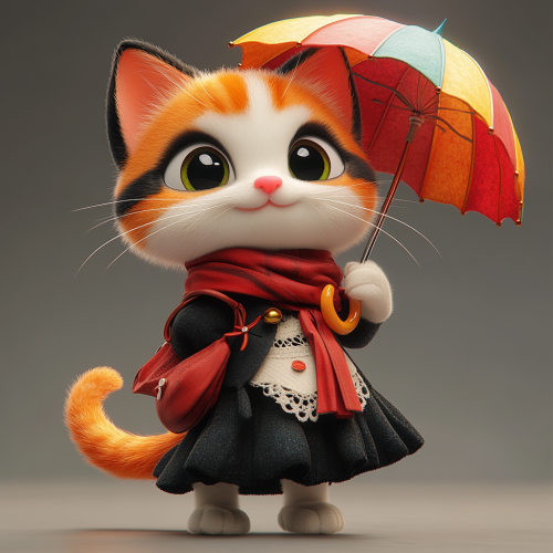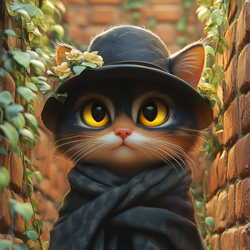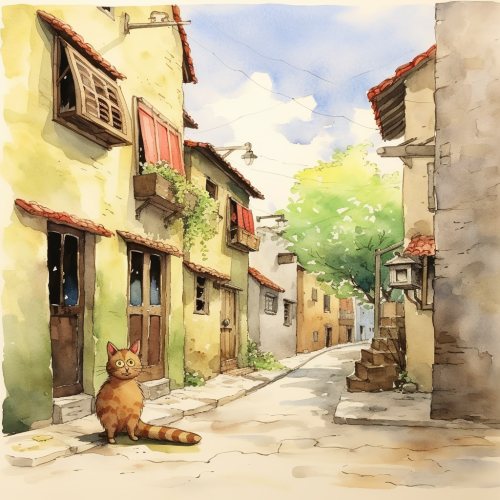 Chibi calico cat watching fish, cozy studio Ghibli style.