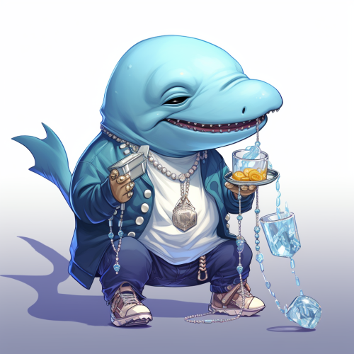 cartoon style whale with rapper jewerly on and cool outfit drinking water.