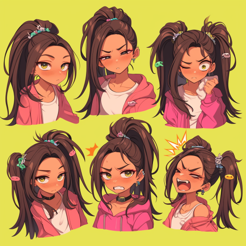 9 divisions, Gal, brown skin ,Only forward-facing angles, seen from the front,Various hairstyles and outfits, chibi,Joy, anger, sorrow, and happiness --niji 6
