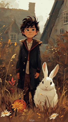 a beautiful illustration of a 10 year-old boy with dark hair wearing a magician's outfit and standing next to his human size white rabbit, as if posing for a portrait, in the style of dark black and brown, kawaii chic, Sarah Andersen, minimalist nature studies, flickr, cartoon-like figures, Halloween --ar 9:16 --stylize 250 --v 6.0