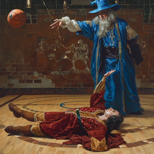 a cavalier dressed in red and brown is laying on a basketball court. A large magician wearing blue and silver stands above him, casting a spell. --v 6.0