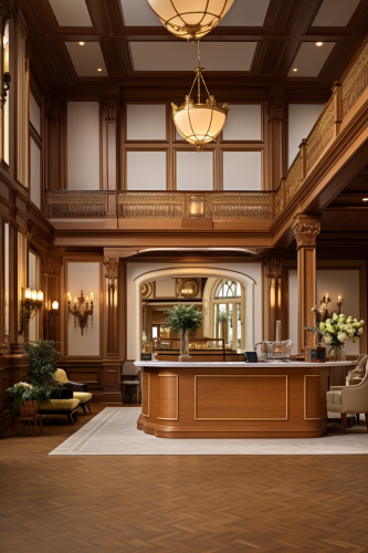 Interior architectural hi-res editorial award photo boutique hotel, grand lobby and guest services desk, white and gold color palette, victorian elegance, in Half Moon Bay, cedar walls, brass fixtures, hardwood floor, warm lighting, detailed, high resolution, photorrealistic, shot with a Sony Alpha a7R IV with 35mm f/2.8 GM lens --ar 2:3 --v 5.2 --style raw