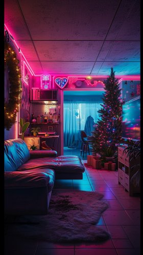 80s style one room home, nice landscape, neon lights, xmas tree --ar 9:16 --v 6.0