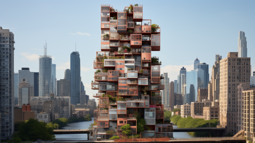 a skyscraper in chicago resembling the style of favelas, --ar 16:9