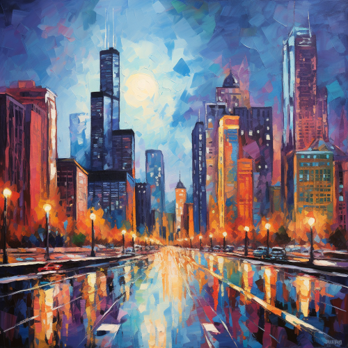 produce an abstract cityscape, Chicago skyline, pallet knife style, impasto style, thick paint, various colors, vivid, night
