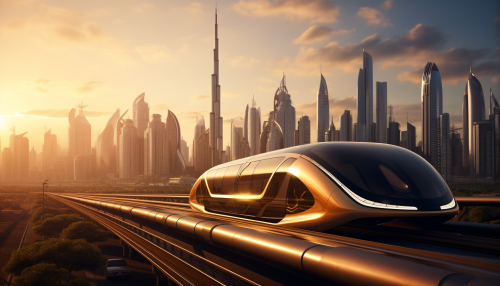 City Skyline, skyline features a fusion, Arabian, structures. The buildings have a golden, Electric Vehicle (EV, electric vehicle is cruising, road. The vehicle, aerodynamic design --ar 7:4
