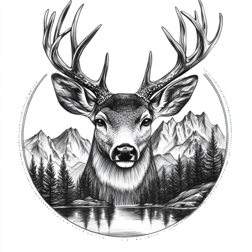 white tail deer, face of a white tail deer, mountains in the background, realism, tattoo design, black and grey, a lake underneath the head of the white tail deer.