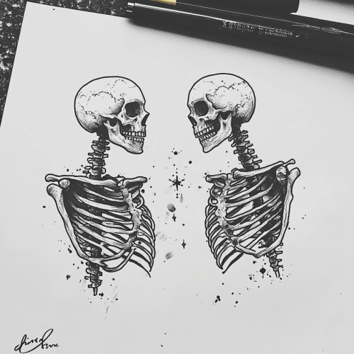 Black and grey tattoo design symbolizing past love and twin flames, with two skeletons as lovers intertwined, representing the same soul in different bodies. The skeletons should appear as though they are merging cohesively, their bones blending seamlessly together. The design should convey a sense of deep, cosmic connection, as if their union transcends the physical world. Incorporate subtle ethereal elements like faint flames or stars, adding a mystical atmosphere. The shading and fine linework should highlight the intimacy and eternal bond between the two skeletons