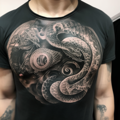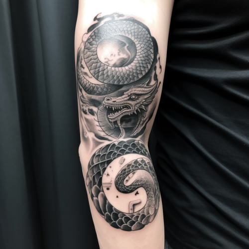 black and grey tattoo with white lettering, figura serpentinata, staining, cobra, qing dynasty dragon, ouroboros, twisting, writhing, forming infinity, eating itself --v 5.0
