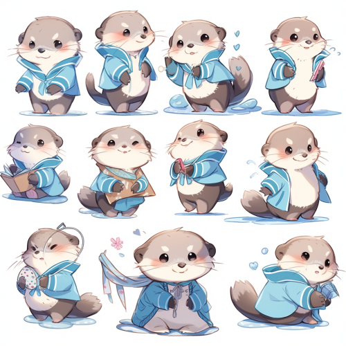 character model sheet of a little otter mom wearing a blue jacket and a white headscarf, many different poses and expressions, comic book style, chibi cute, watercolor --niji